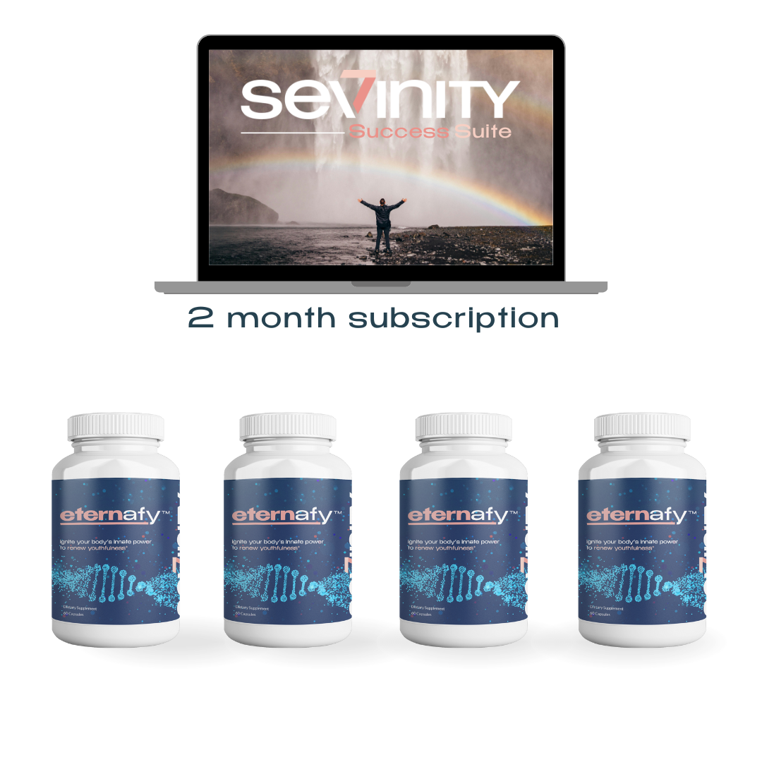 Elevate your wellness and business growth with the Elevate Founders Bundle featuring 4 bottles of eternafy—our next-gen cellular health formula—paired with 2 months of powerful mindset and business training inside the Sevinity Success Suite, along with access to the Spotlight Program to help you grow your brand with confidence---and a full year Brand Partner membership.